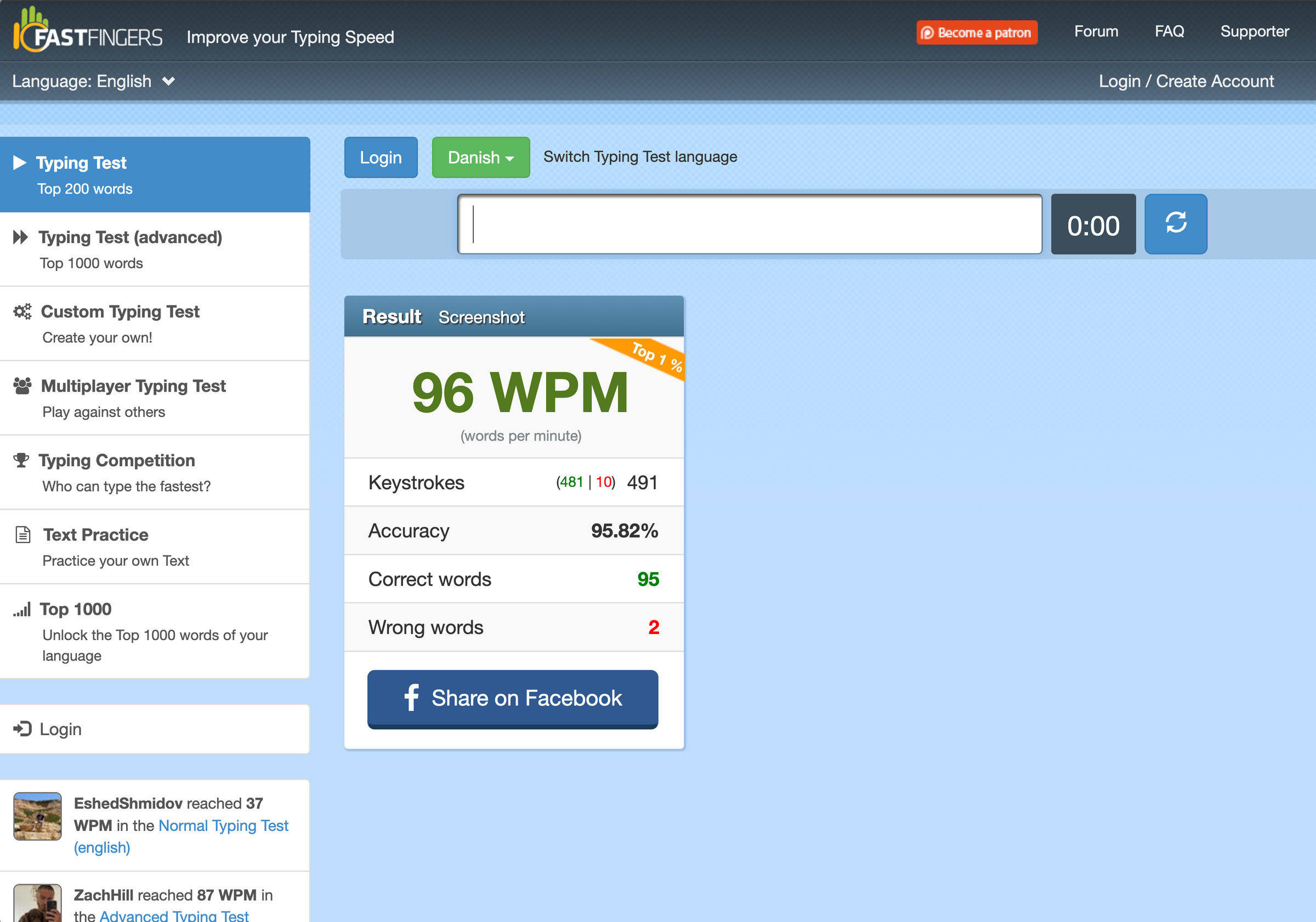 10fastfingers.com. Den tester dig med rigtige ord, hvilket er mere naturligt og giver dig en nøjagtig virkelighedsestimering af din skrivehastighed. Keybr.com. Denne hjemmeside “algoritmisk” bestemmer svaghederne i din skrivning og udfordrer dig derefter til at forbedre dig. På skærmbilledet herover bruger jeg 10fastfingers.com som giver mig en masse “ægte” ord, som jeg skriver ind. Jeg svinger mellem 93 og 101 WPM her.